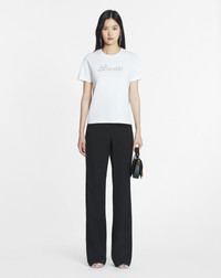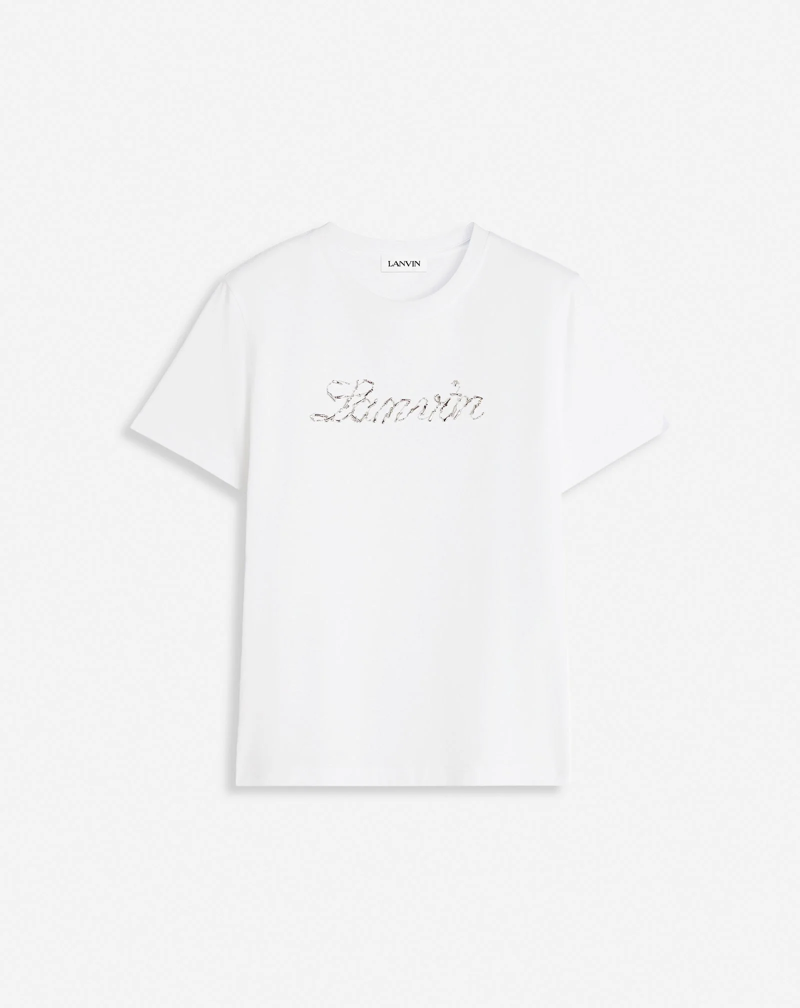 Ideal for casual wear, this t-shirt adds a touch of elegance with its handwritten logo on the chest. The House logo is embroidered with beads, a delicate detail added to the ensemble. Details - Lanvin embroidered cotton T-shirt - Straight fit - Round neck - 3D metal beads - Made in Italy Size & fit - This style fits true to size, take your normal size - For more information, please see our size guide. Composition - Main fabric : 100% cotton knitted,10% metal SKU: RW-TS9030-J176-P2501XL