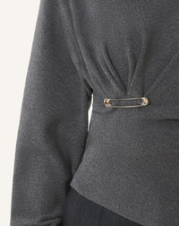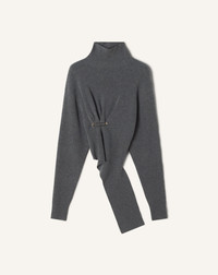This sweater is crafted from a blend of wool and cashmere. The fabric is soft, lightweight, and warm, and features draping reminiscent of pieces found in the Maison's archives. The brooch adorning this sweater adds an elegant, modern touch to a casual outfit. Details - Wool and cashmere sweater - Tailored fit at the waist - Turtleneck - Dropped shoulders - Ribbed cuffs - Draped detail at the waist - Lanvin signature brooch - Made in Italy Size & fit - This style fits true to size, take your normal size - For more information, please see our size guide. Composition - Main fabric : 80% wool knitted,20% cashmere knitted SKU: RW-PO0004-K065-H25150XS