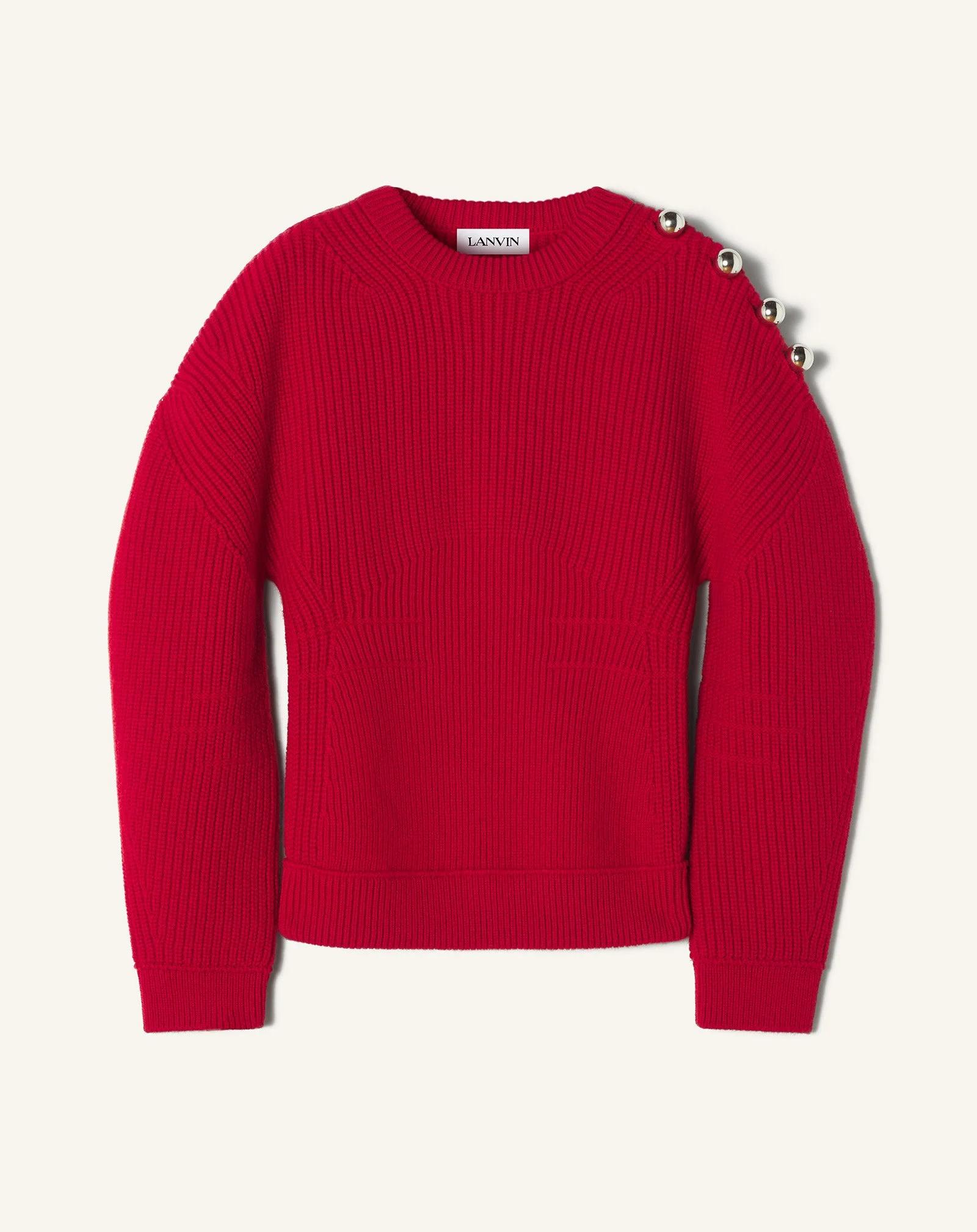 The balloon sleeves on this sweater are designed to accentuate its rounded, cocoon-like shape. The straight ribbing and horizontal darts create a visual contrast, recalling one of the Maison's signature aesthetics. Details - Wool ribbed sweater - Fitted waist - Round neck - Dropped shoulders - Ribbed cuffs - Silver ball buttons on shoulder - Made in Turkey Size & fit - This style fits true to size, take your normal size - For more information, please see our size guide. Composition - Main fabric : 100% wool knitted SKU: RW-PO0003-K066-H25354XS