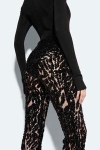 Featured in the Holiday 25 Collection Semi-sheer pant featuring beautiful abstract sequins with a relaxed leg. Invisible zipper closure. Wear this pant alone or pair it back to the matching dress. - Material: 100% Polyamide - Care: Professional Dry Clean Only - Fit: True To Size. - Model is 5'10 and Wearing a size 2