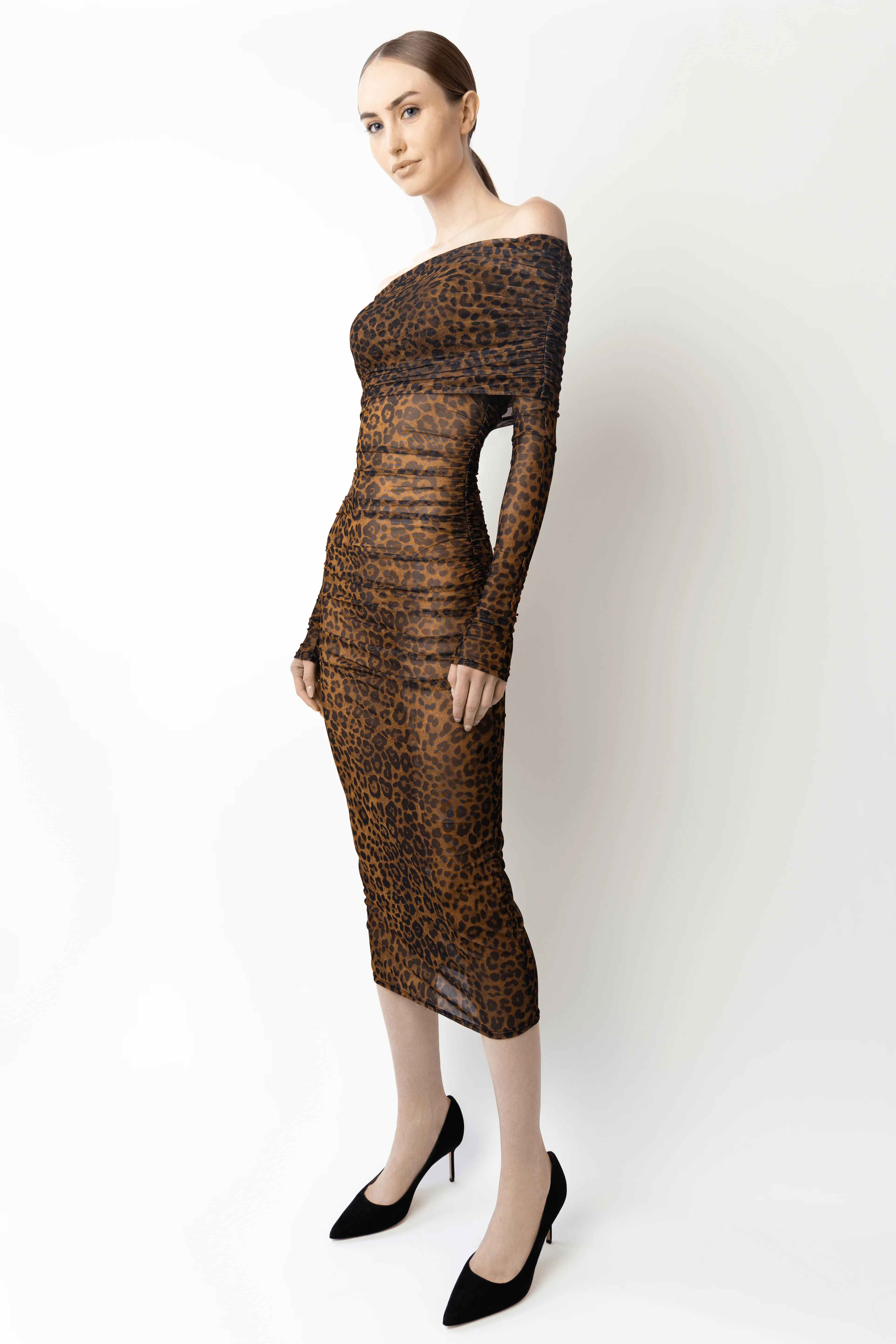 Stretch mesh off the shoulder midi dress in our new custom leopard print. Features ruching throughout. - Material: 95% Polyester, 5% Elastane - Care: Hand Wash Cold or Dry Clean - Fit: True to size - Model is 5'10 and Wearing a Size S