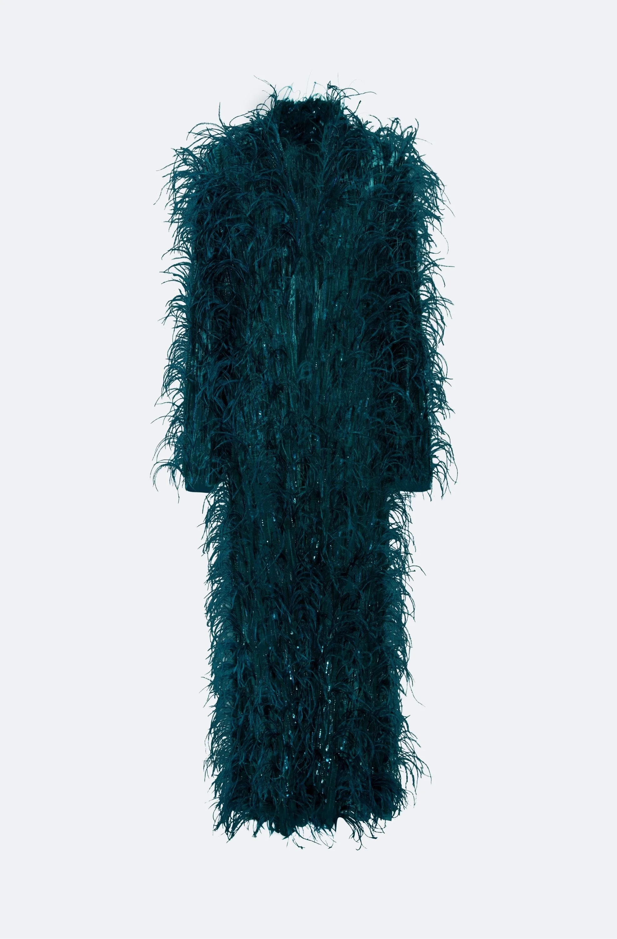 Full-length coat finished with delicate hand embroidered cascading feathers and sequin detailing throughout. - Materials: 100% Nylon, 100% Struthio Camelus - Care: Professional Dry Clean Only - Fit: True to Size - Model is 5'10 and Wearing a Size S