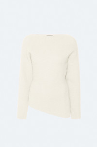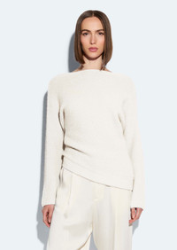 Featured in the Holiday 25 Collection Airy cashmere silk boatneck sweater features ribbed detail throughout. Voluminous sleeves and an asymmetric hem. - Material: 79% Cashmere, 21% Silk - Fit : True to Size. - Care: Dry Clean Only - Model is 5'10 and Wearing a size Small