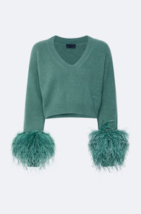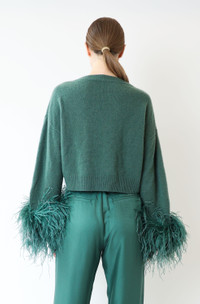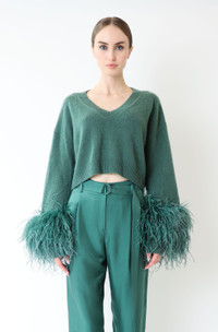 V-neck sweater in our cozy airy cashmere silk. Features a low neckline, slightly cropped fit and feathers at the wrist. - Material: 79% Cashmere, 21% Silk, 100% Struthio Camelus - Care: Hand Wash Cold or Dry Clean - Fit: True to size - Model is 5'10 and Wearing a size Small