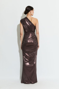 Featured In The Pre Fall 2025 Collection One shoulder maxi dress in our bestselling coated jersey. Features ruched detail throughout the body. - Material: 93% Polyester, 7% Elastane - Care: Hand Wash Cold or Dry Clean - Fit: True to size - Model is 5'10 and Wearing a Size S