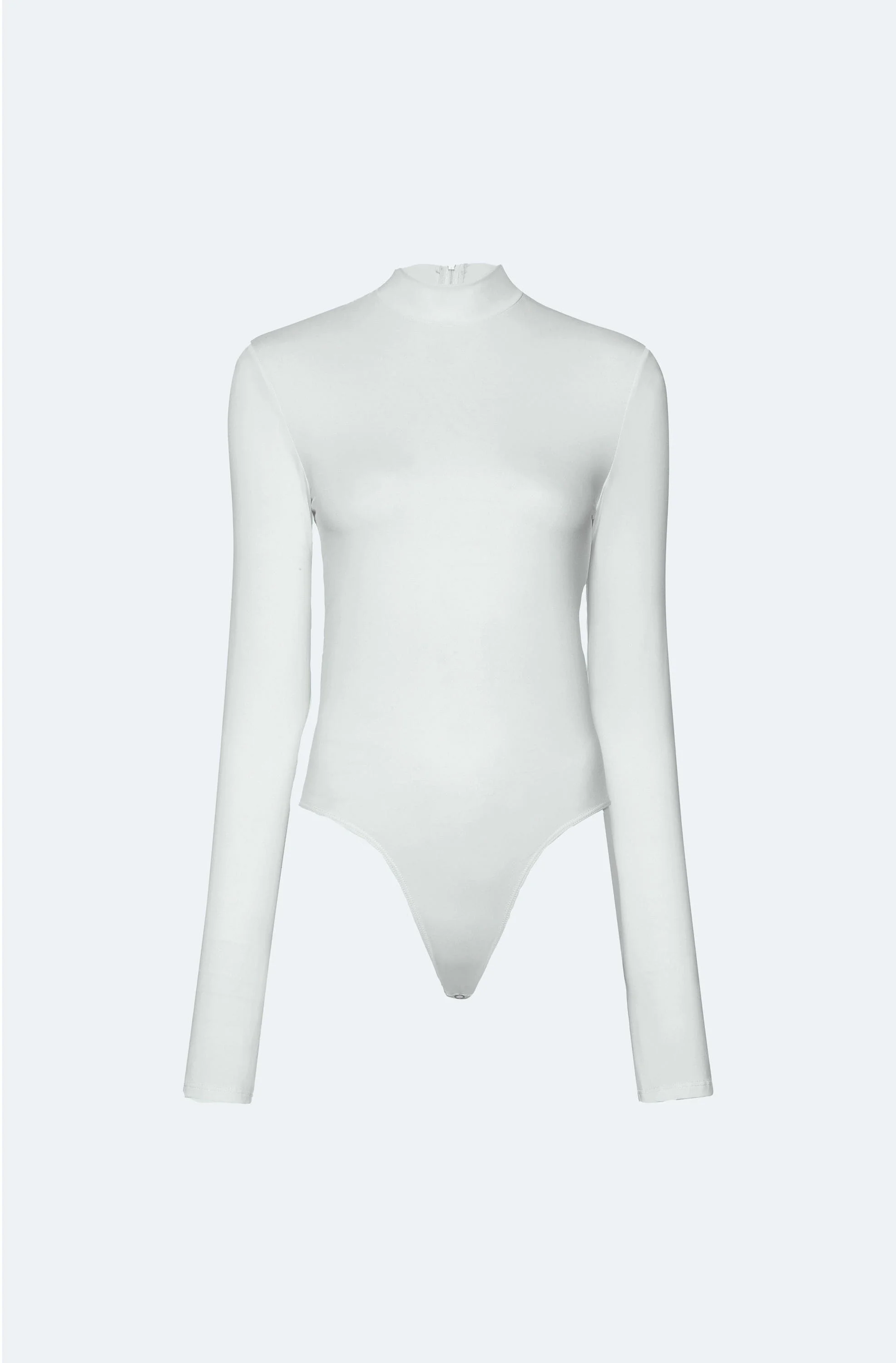 Featured in the Spring 25 Collection This stretch compact jersey mock neck bodysuit features long sleeves with subtle stacking detail at wrist and center back invisible zipper and snap closure. - Material: 83% Recycled Polyester 17% Elastane - Fit: Slim Fit. True to Size - Care: Machine Wash Cold - Model is 5'10 and Wearing a size S