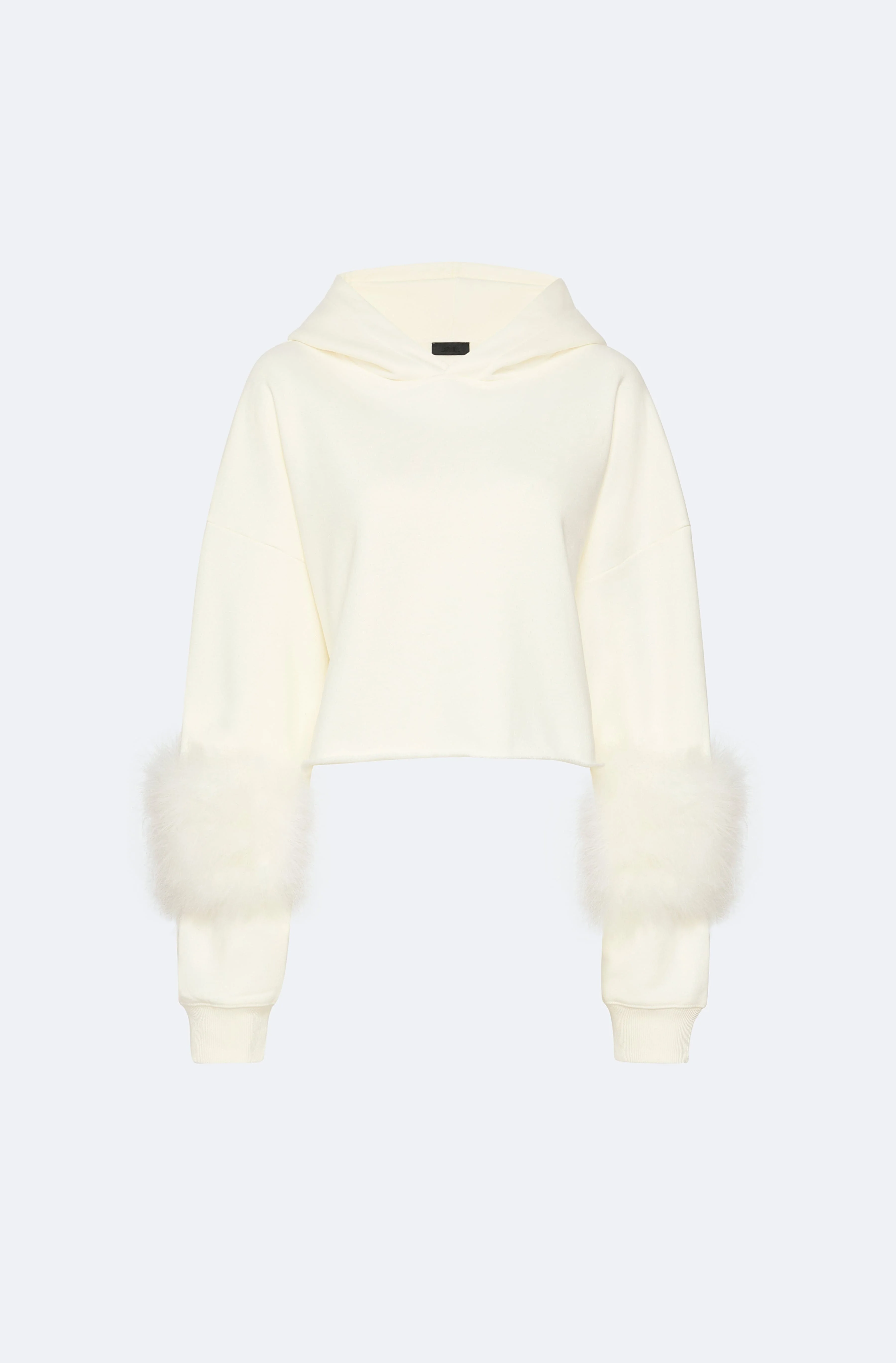 Featured in the Holiday Gift Guide Collection Sweatshirt in a comfortable, everyday cotton fabrication. Raw hemline for a slightly cropped fit. Feathers at the arms. Pair back to the cotton cargo sweatpants for the full look. - Material: 100% Cotton - Trim: 100% Marabou Feathers - Care: Clean by Fur Specialist Only - Fit: True to size. - Model is 5'9 and Wearing a size Small