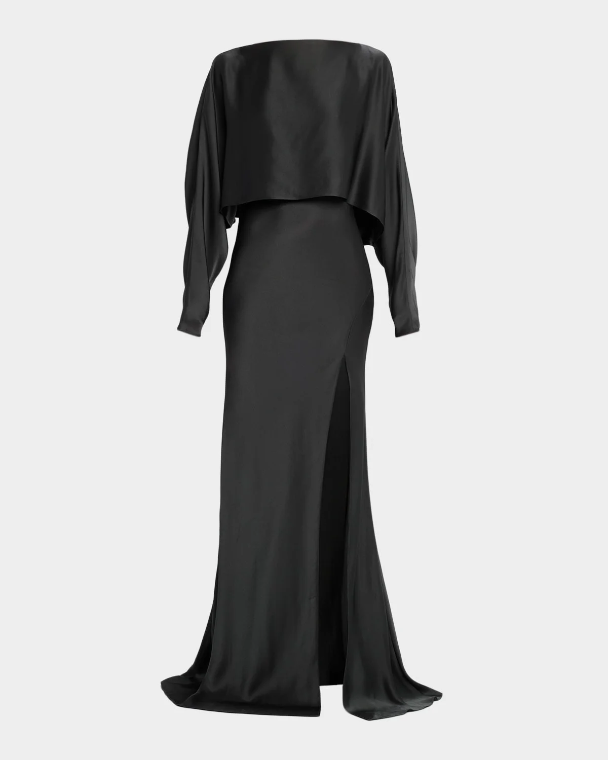 - Layered with a fluid cape bodice, this LAPOINTE satin gown flows into a floor-sweeping hem for an elegant, softly flared silhouette - High neckline - Long dolman sleeves - Thigh-high side slit - Full length - Column silhouette - Invisible back zipper - Acetate/viscose - Made in the USA