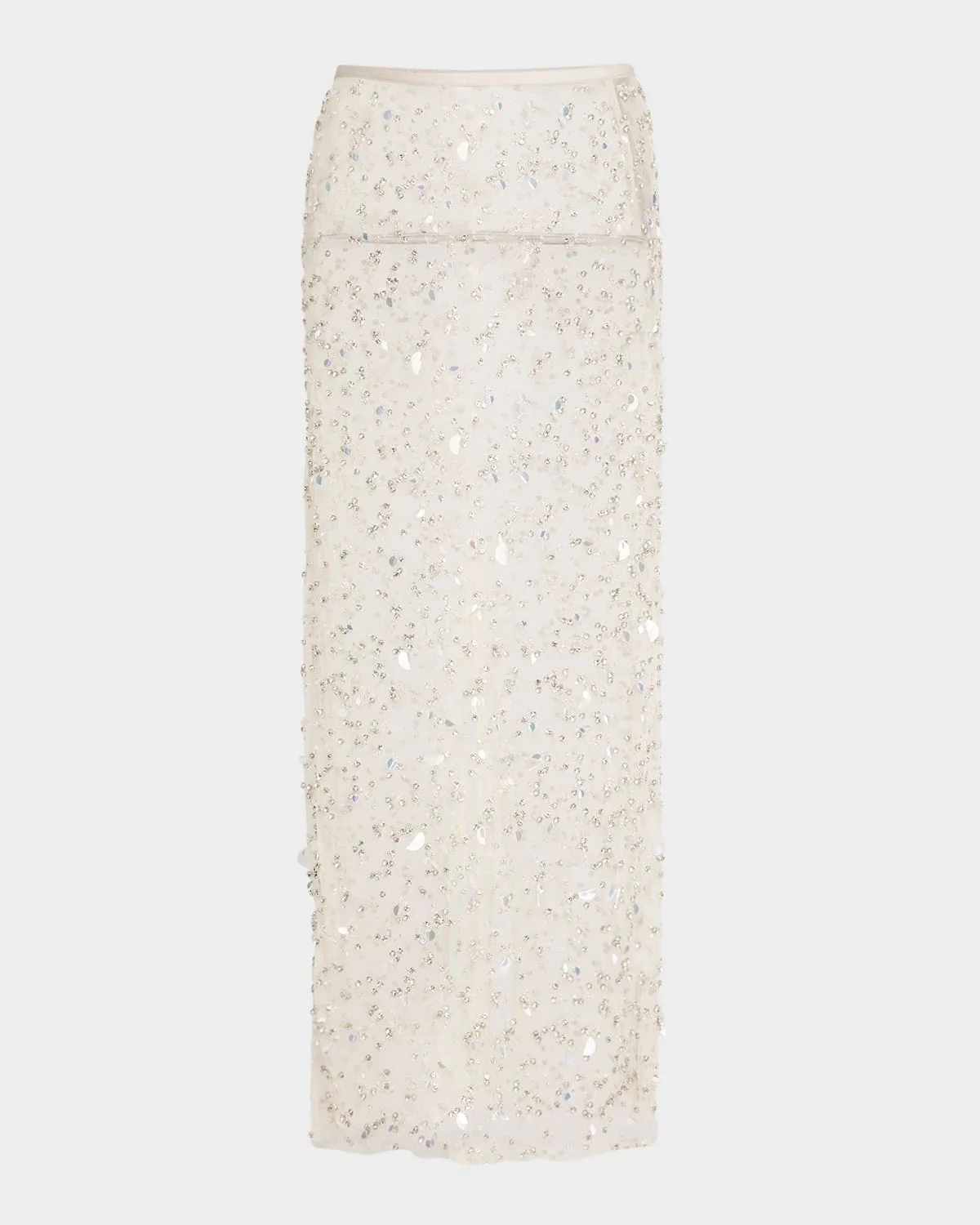 LAPOINTE sheer mesh skirt embellished in crystal and sequin embroidery Mid waist Full length Skirt falls straight from hip to hem Centerback slit hem Hidden closure Nylon/polyamide Imported