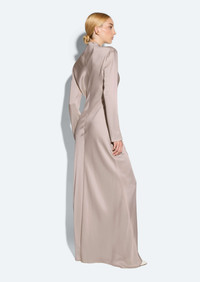 Tab gown in our luxurious doubleface satin fabrication. Shirred tab allows for adjustable coverage at the leg. Invisible zipper at the center back. - Materials: 61% Acetate, 39% Viscose - Fit: True to size - Care: Dry Clean Only