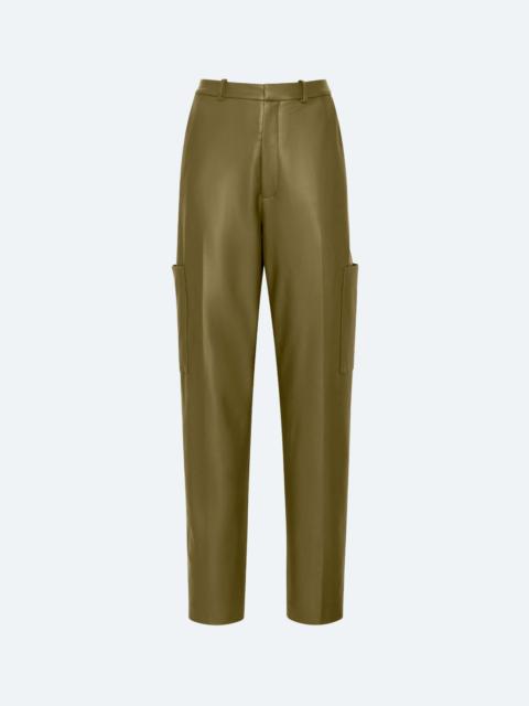 Featured in the Resort 25 Collection Utility jogger in our luxurious stretch faux leather fabrication. Stretch throughout fabric for ultimate comfort. Features side pockets and elasticated button waist. - Material: 48% Polyurethane, 47% Polyester, 5% Spandex - Fit: True to Size - Care: Hand Wash or Dry Clean - Model is 5'11" and Wearing a size small