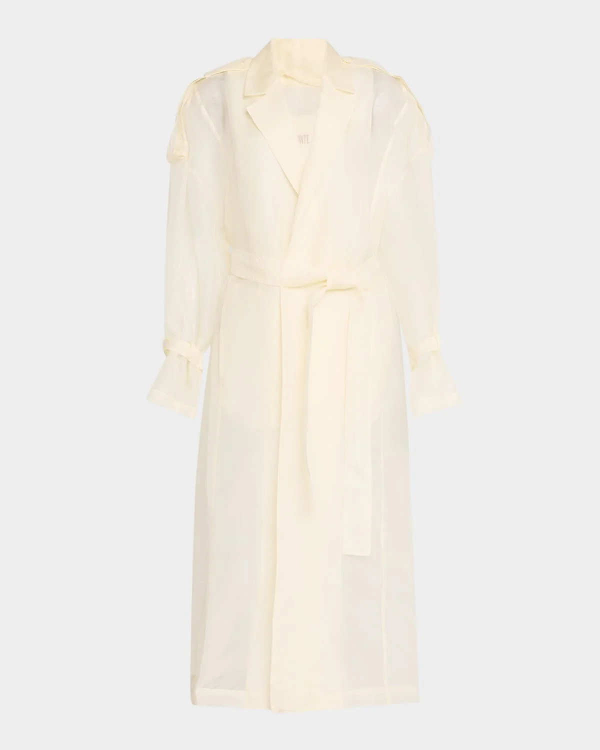 LAPOINTE silk organza trench coat featuring detachable ostrich feather embellished cuffs and a selfbelt Notch lapels; open front Long sleeves Shoulder epaulets Side split pockets Straight fit Hem falls below the knee Silk/feathers Made in USA