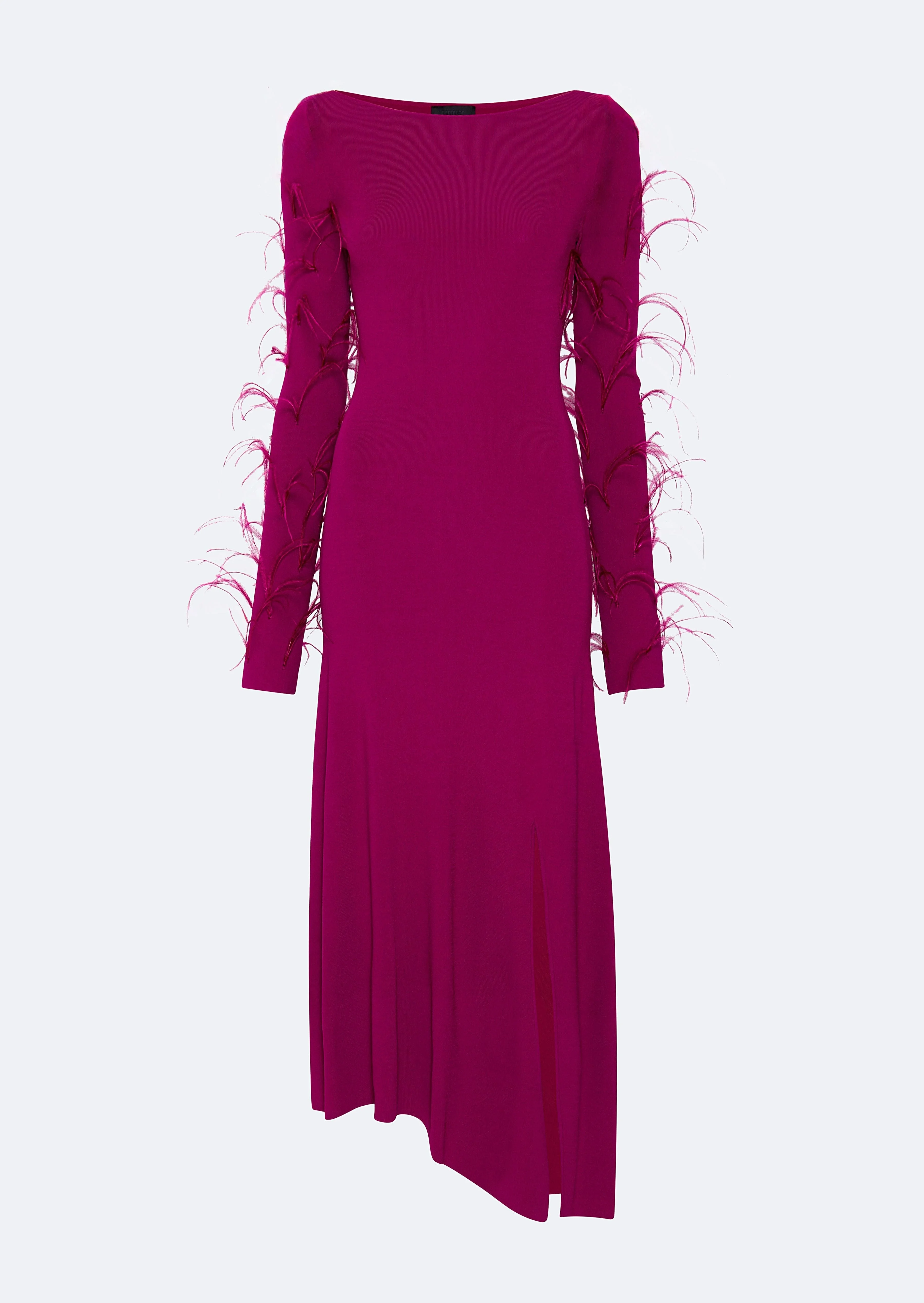 Featured in the Holiday 25 Collection Boatneck dress in our bestselling matte viscose fabrication. Features slits at the wrists and at the asymmetric hemline. Feather embroidery throughout the sleeves. - Material: 83% Rayon Viscose, 17% Elite Polyester - Trim: 100% Ostrich Feathers - Care: Clean by Fur Specialist Only - Fit: True to size.