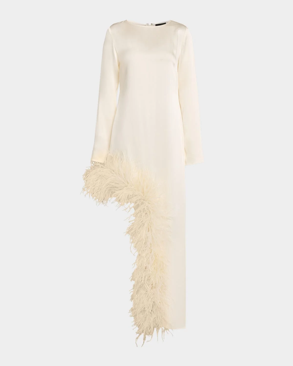 Feather-Trim Asymmetric Long-Sleeve Satin Dress