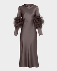 Feather-Trim Long-Sleeve Satin Bias Midi Dress