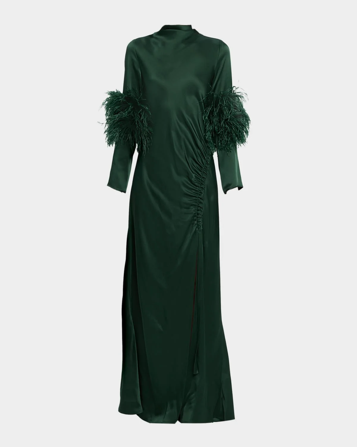 Feather-Trim Long-Sleeve Satin Maxi Dress