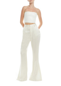 - High-Waisted - Flared Hem, Floor Length Leg - Slit Detail at Ankle - Inseam: 32 1/2" - Material: Satin (61% Acetate, 39% Viscose) - Care: Professional Dry Clean Only - Country of Origin: USA