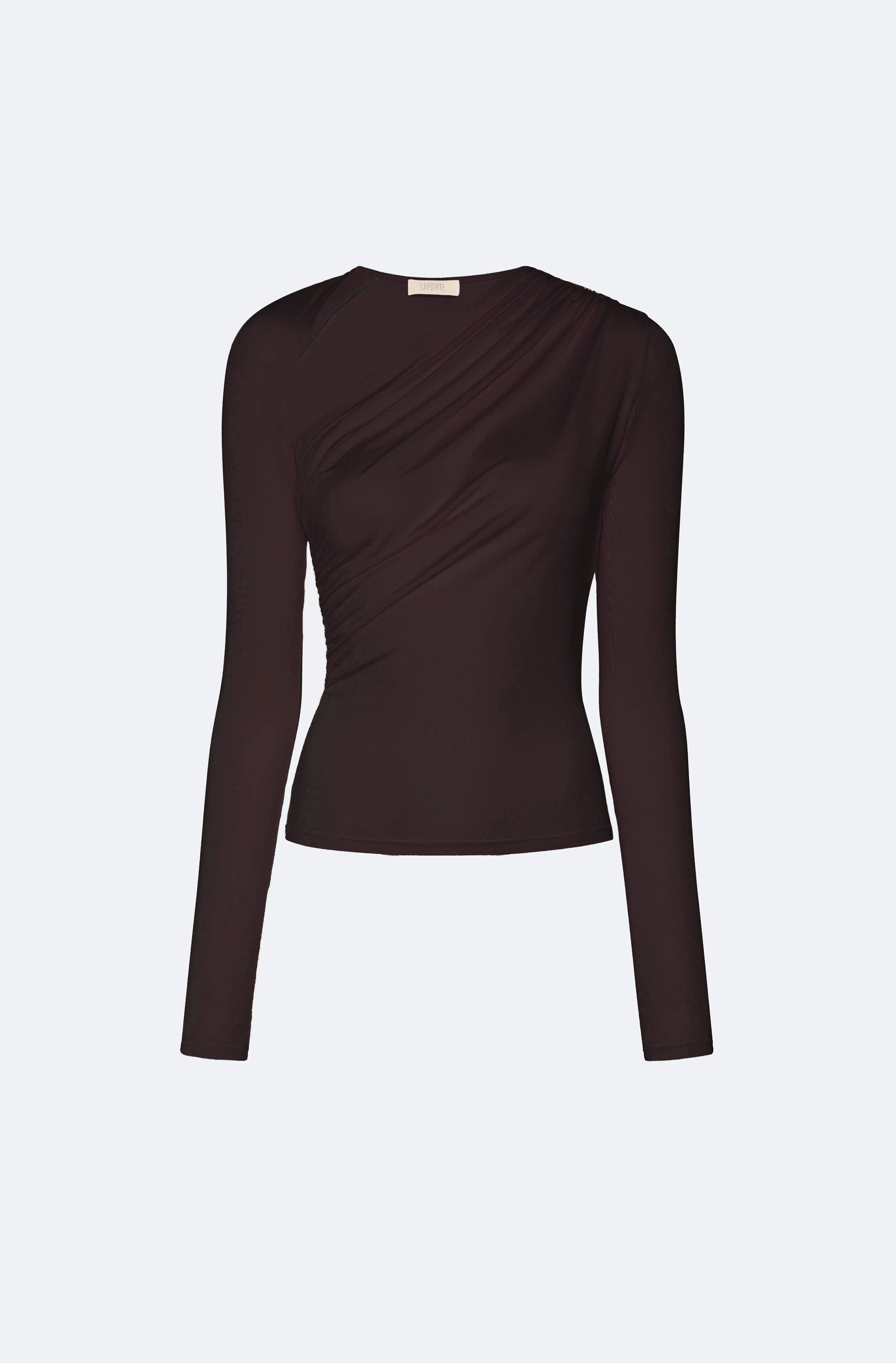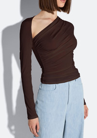 Asymmetric top in our ultra-comfortable lightweight jersey featuring ruching throughout the body and opening at the shoulder. - Materials: 94% Acetate, 6% Elastane - Care: Machine Wash Cold - Fit: Slim Fit. True to Size - Model is 5'10" and Wearing a S