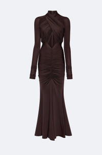 Halter neck gown in our ultra-comfortable lightweight jersey featuring a center-front cutout and ruching throughout. Fastens with invisible zipper at center back. - Materials: 83% Viscose, 17% Nylon - Care: Machine Wash Cold - Fit: True to Size - Model is 5'10" and Wearing a S