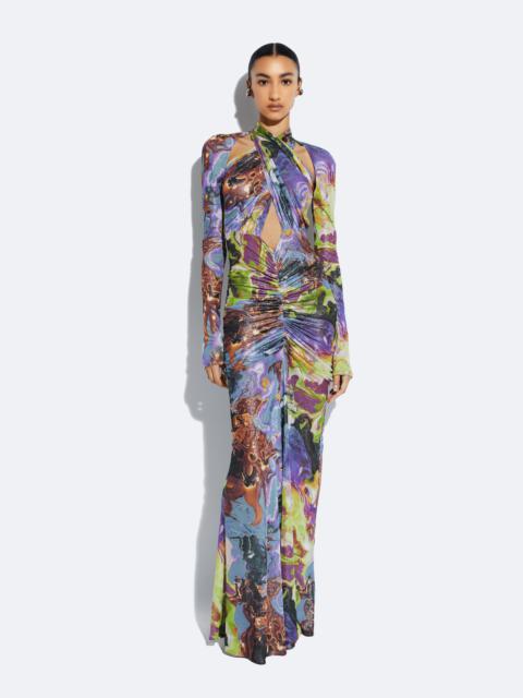 Featured In The Fall 2024 Collection This stretch jersey halter neck gown features a center front cut out and ruching throughout with an invisible zipper at center back. - Materials: 61% Acetate, 39% Viscose - Care: Machine Wash Cold - Fit: True to Size - Model is 5'10" and Wearing a S