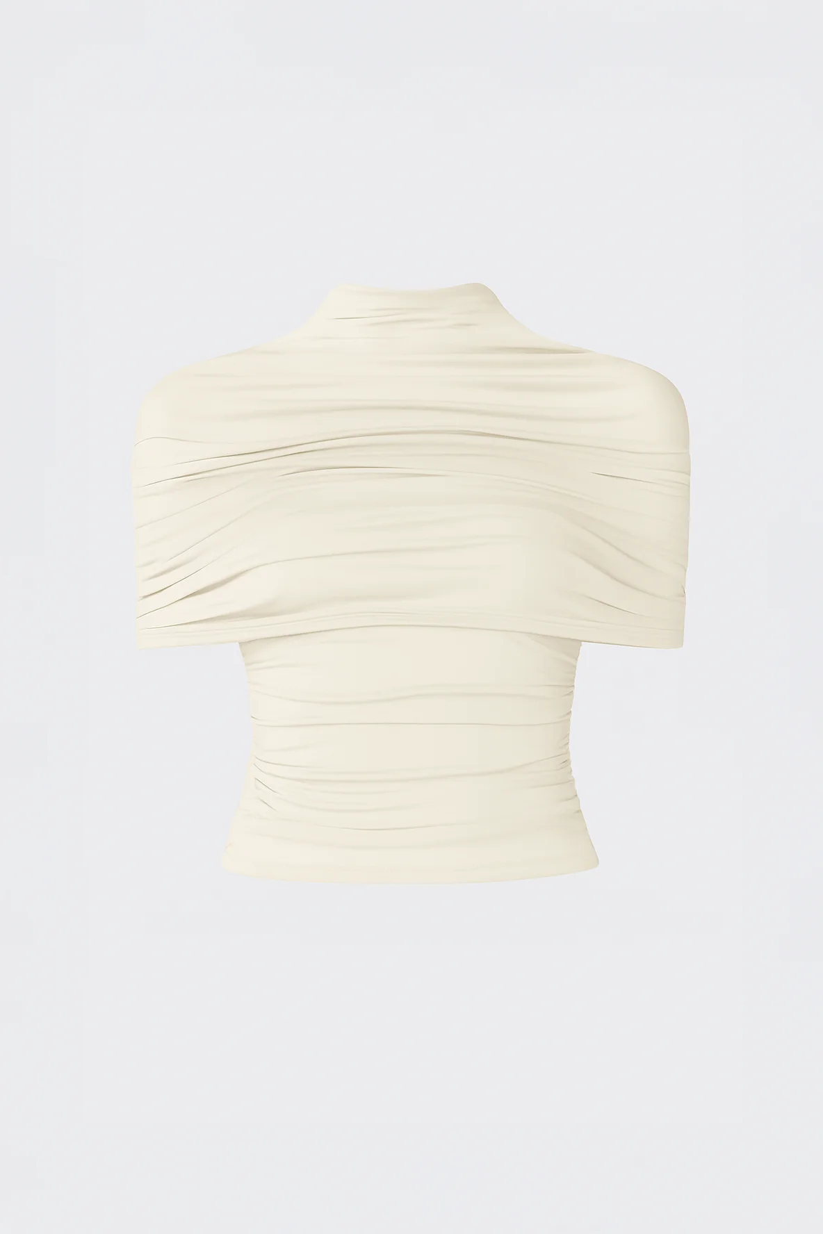 Mock neck top in our ultra comfortable lightweight jersey featuring a ruched, cape-like overlay. - Material: 94% Acetate, 6% Elastane - Care: Hand Wash Cold or Dry Clean - Fit: True to size