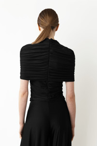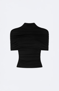 Mock neck top in our ultra comfortable lightweight jersey featuring a ruched, cape-like overlay. - Material: 94% Acetate, 6% Elastane - Care: Hand Wash Cold or Dry Clean - Fit: True to size - Model is 5'10 and Wearing a Size S