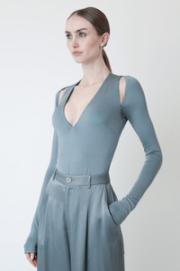 Jersey V-neck bodysuit in our everyday, ultra comfortable lightweight jersey fabrication. Features cutouts at the shoulders. Invisible zipper at the back and snap closure. - Material: 94% Acetate, 6% Elastane - Care: Handwash or Dry Clean - Fit: True to size. For a more relaxed fit, size up. - Model is 5'10 and Wearing a S
