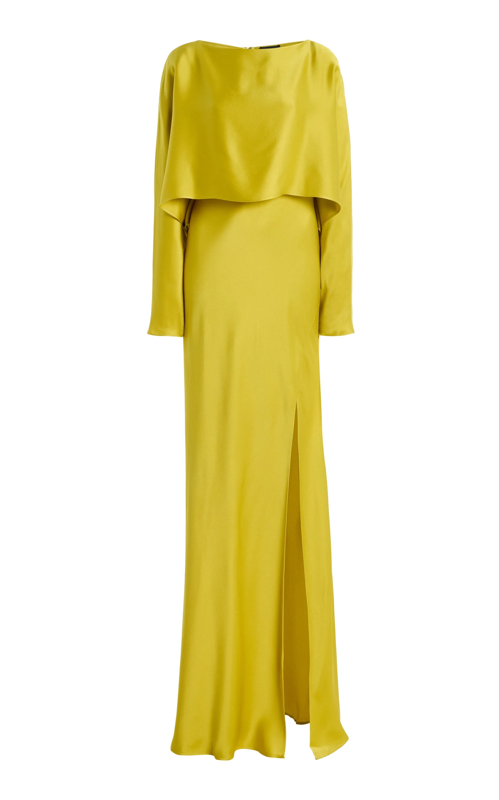 The NYC mainstay continues to put a notably edgy spin on her signature glossy yet slouchy luxe glamour. Find her signatures an impressive display of eco-certified fabrics. Satin gown featuring a fluid georgette cape overlay and side slit. PRODUCT DETAILS - Fall '25 - Zip fastening - Composition: 61% acetate, 39% viscose - Designer color: Chartreuse - Dry clean - Made in the USA