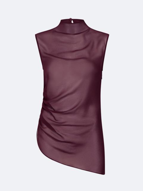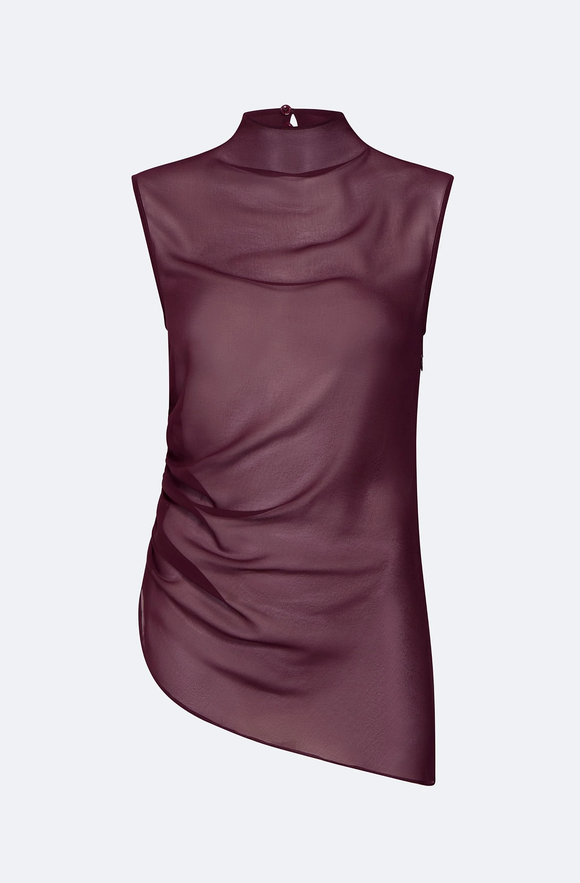 Featured In The Pre Fall 2025 Collection Sheer mock neck sleeveless top in our lightweight georgette fabric featuring asymmetric ruched side. Fastens with double button keyhole at neck and side body zipper. Pair with our lightweight georgette wide leg pants to complete the look. - Material: 100% Polyester - Care: Dry Clean Only. This item is crafted from delicate fabric. Handle with care to maintain its appearance - Fit: True to size - Model is 5'10 and Wearing a Size 2
