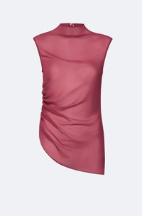 Sheer mock neck sleeveless top in our lightweight georgette fabric featuring asymmetric ruched side. Fastens with double button keyhole at neck and side body zipper. Pair with our lightweight georgette wide leg pants to complete the look. - Material: 100% Polyester - Care: Hand Wash Cold or Dry Clean - Fit: True to size - Model is 5'10 and Wearing a Size 2