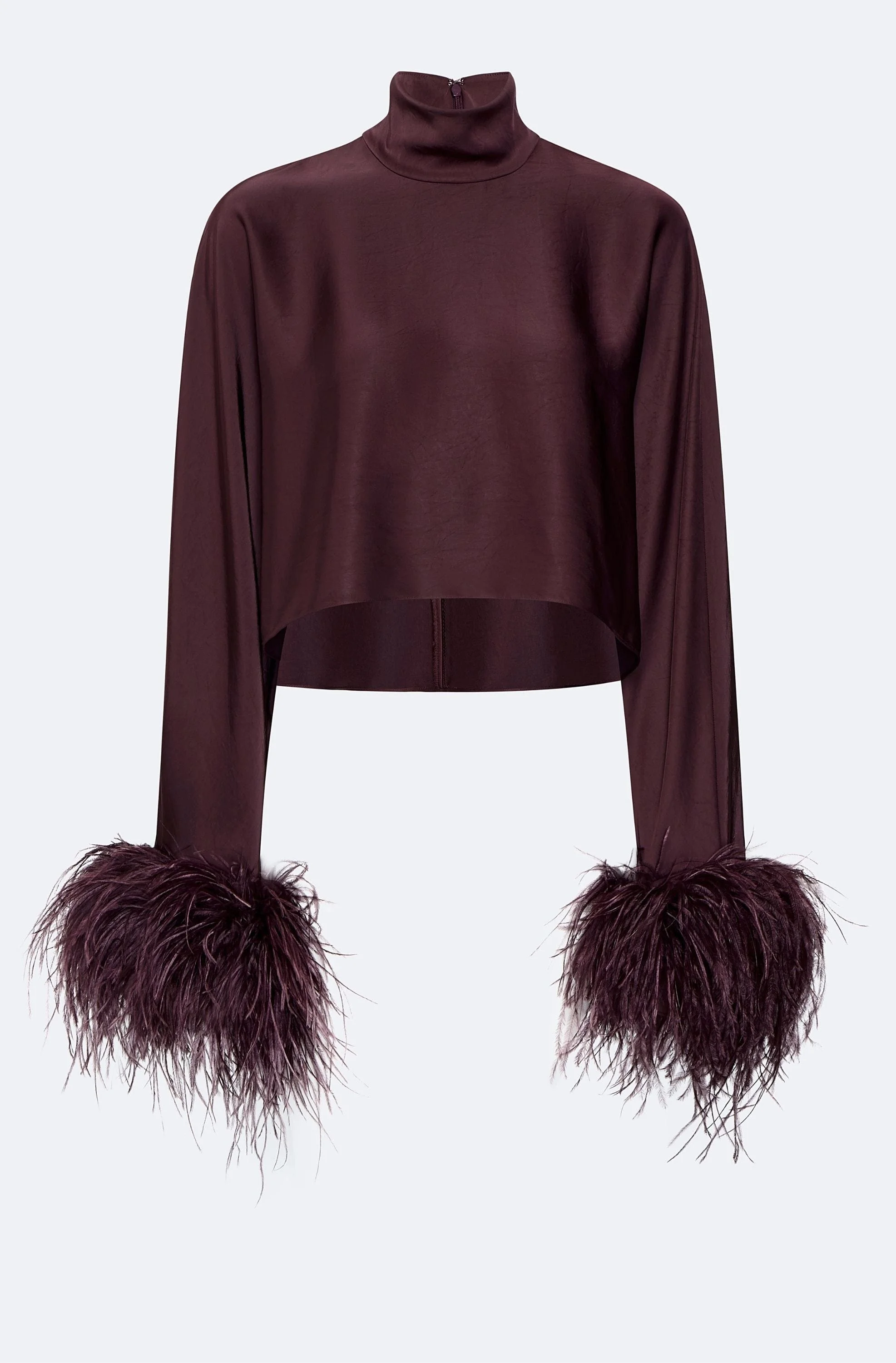 Featured In The Pre Fall 2025 Collection Long sleeve caftan top featuring a mock neckline in our luxurious, lightweight textured satin and feathers at the wrists. Fastens with zipper closure at back neck. - Material: 100% Polyester - Care: Hand Wash Cold or Dry Clean - Fit: True to size - Model is 5'10 and Wearing a Size S