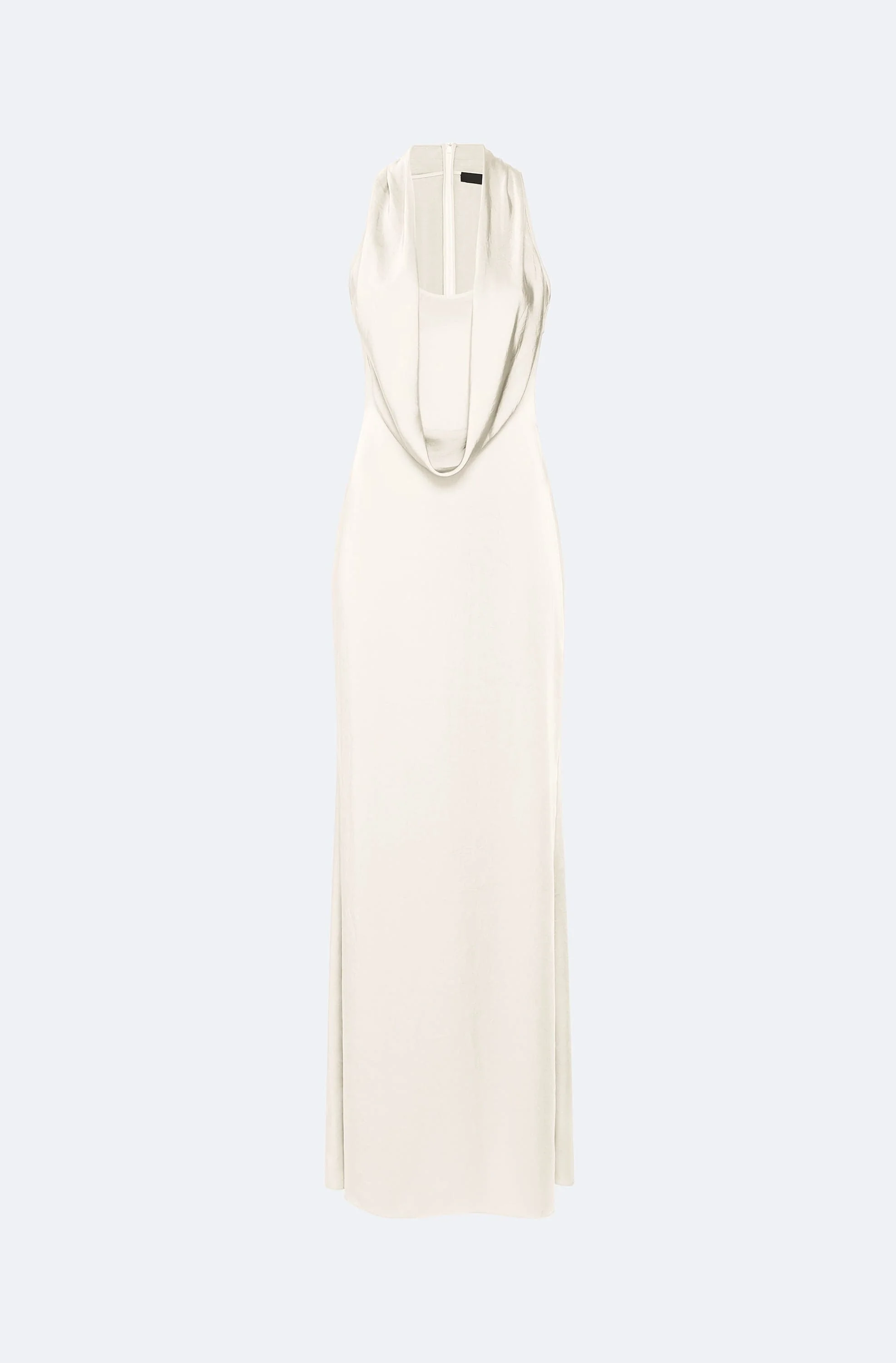 Featured in the Spring 25 Bridal Collection Cowl neck gown in our lightweight satin. Features a draped, layered neckline with an invisible zipper at the back. - Material: 100% Polyester - Care: Hand Wash Cold or Dry Clean - Fit: True to size - Model is 5'10 and Wearing a size Small