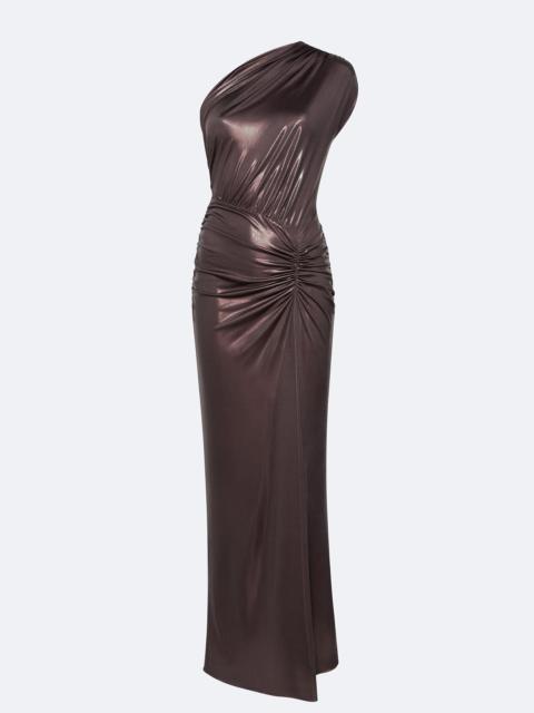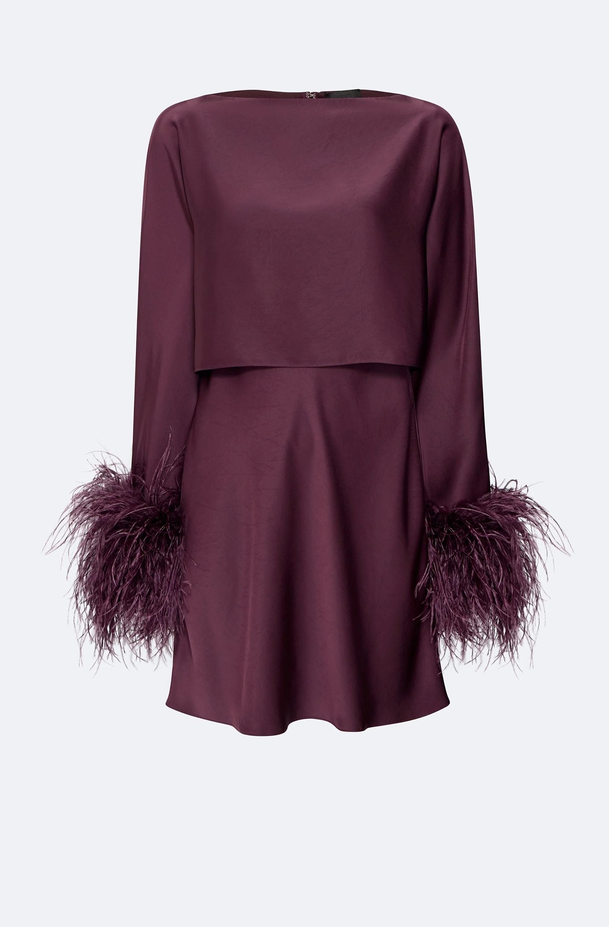 Featured In The Pre Fall 2025 Collection Long sleeve mini dress with draped layered top in our luxurious, lightweight textured satin. Features feathers at the wrist and center back zipper closure. - Material: 100% Polyester, 100% Struthio Camelus - Care: Hand Wash Cold or Dry Clean - Fit: True to size - Model is 5'10 and Wearing a Size 2
