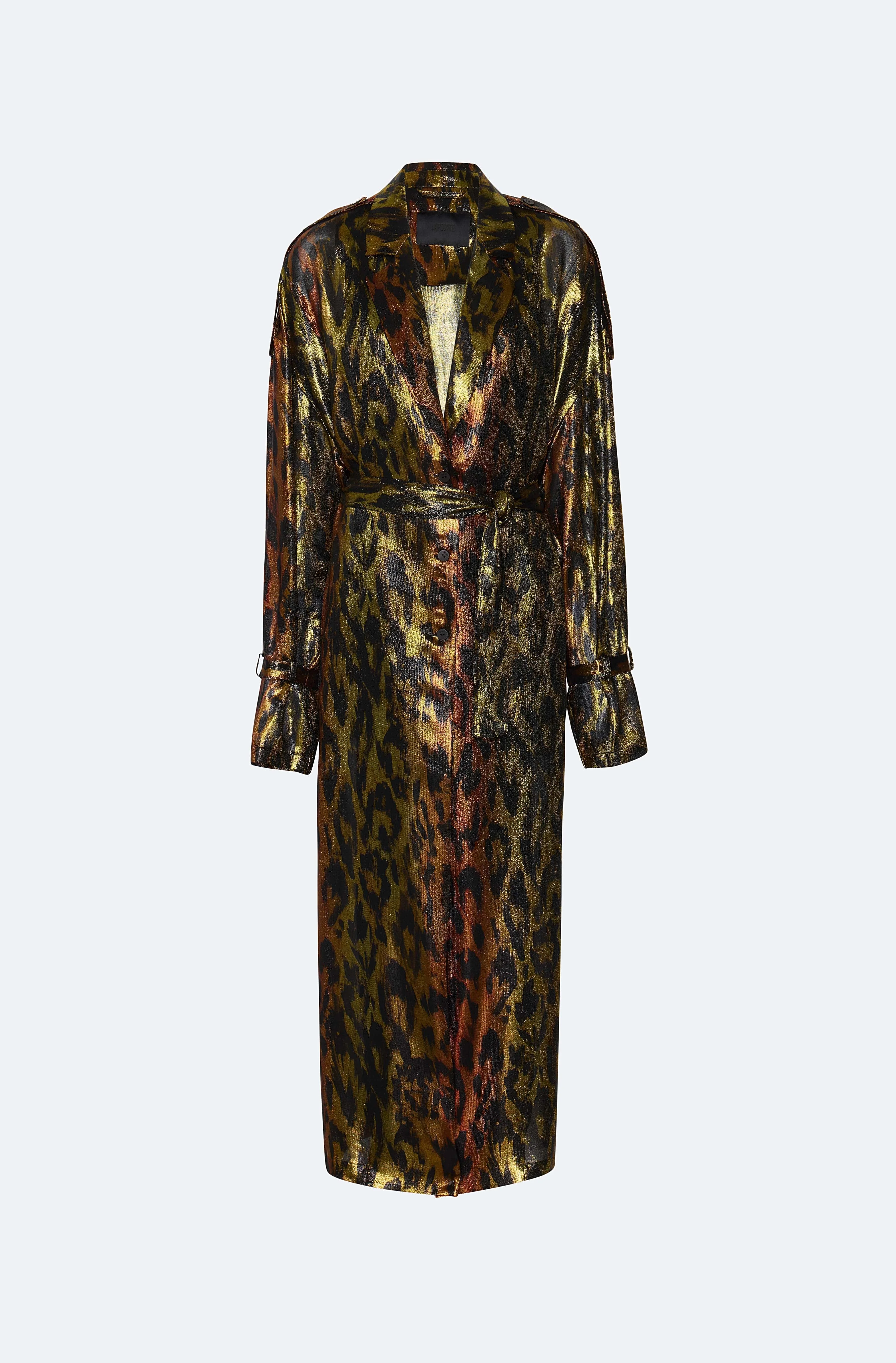 Featured in the Holiday 25 Collection Leopard printed trench in a vibrant lurex fabrication. Features a d-ring belt at the waist for an adjustable fit - Material: 72% Silk, 28% Metallic - Care: Dry Clean Only - Fit: Oversized Fit. For A Less Oversized Fit, Size Down. - Model is 5'11 and Wearing a size 2