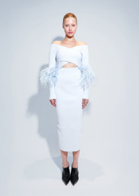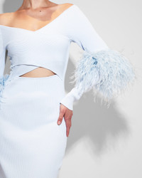 Our bestselling matte viscose cross front midi dress features an off the shoulder neckline, a cutout at center front, and feathers on the sleeves. - Materials: 83% Rayon, 17% Elite Polyester, 100% Struthio Camelus - Care: Machine Wash Cold - Fit: True to Size - Model is 5'10" and Wearing a S