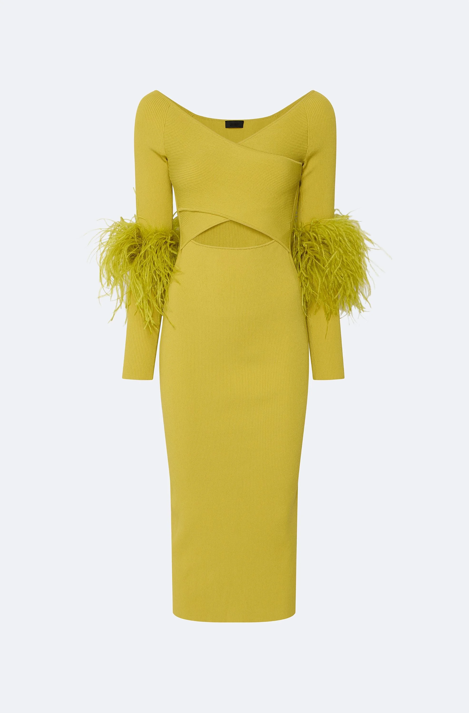Our bestselling matte viscose cross-front midi dress featuring an off-the-shoulder neckline, cutout at center front, and feathers on the sleeves. - Material: 83% Rayon Viscose, 17% Elite Polyester, 100% Struthio Camelus - Care: Hand Wash Cold or Dry Clean - Fit: True to size - Model is 5'10 and Wearing a Size S