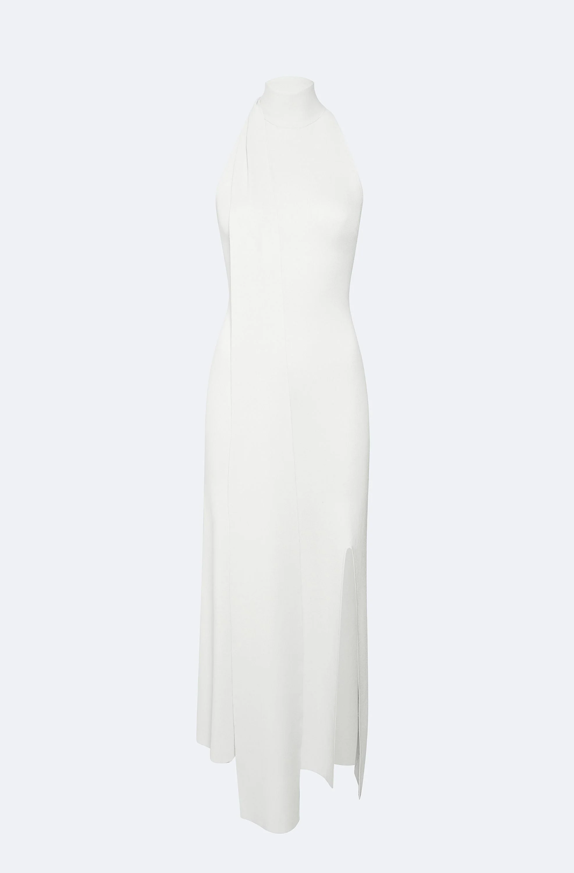Featured In The Pre Fall 2025 Collection Sleeveless high neck halter dress in our crepe matte viscose fabric. Features open back, side slit, tie closure at neck, and long sash ties. - Material: 83% Rayon Viscose, 17% Elite Polyester - Care: Hand Wash Cold or Dry Clean - Fit: True to size - Model is 5'10 and Wearing a Size S