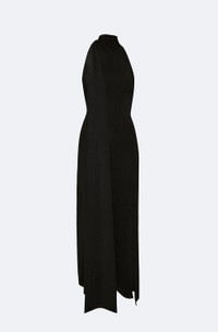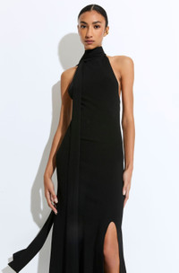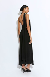 Sleeveless high neck halter dress in our crepe matte viscose fabric. Features open back, side slit, tie closure at neck, and long sash ties. - Material: 83% Rayon Viscose, 17% Elite Polyester - Care: Hand Wash Cold or Dry Clean - Fit: True to size - Model is 5'10 and Wearing a Size S