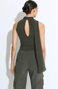 Sleeveless high neck halter top in our crepe matte viscose fabric. Features keyhole opening at back neck, tie closure, and long sash ties. - Material: 83% Rayon Viscose, 17% Elite Polyester - Care: Hand Wash Cold or Dry Clean - Fit: True to size - Model is 5'10 and Wearing a Size S