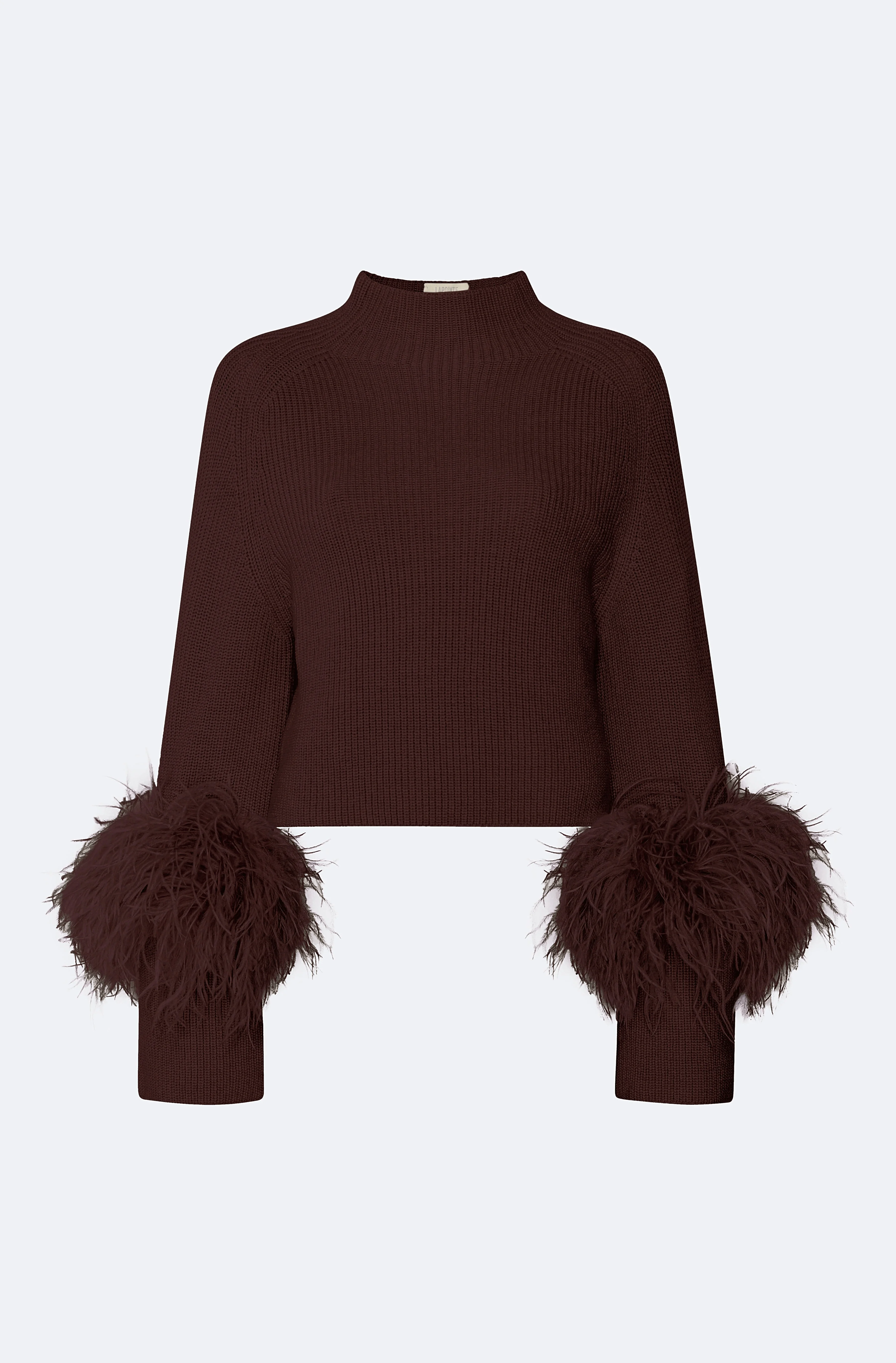 Merino wool mock neck sweater featuring a raglan shoulder with a slit detail at the sleeve and feathers. - Materials: 100% Extrafine Merino Wool - Trim: 100% Real Ostrich Feathers - Care: Professional Care Only - Fit: True to Size - Model is 5'10" and Wearing a S