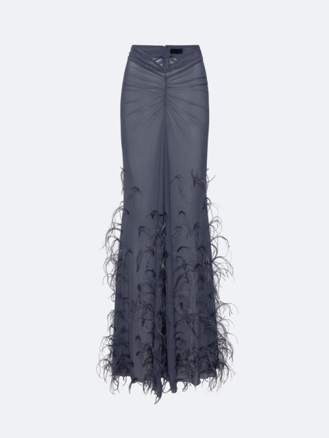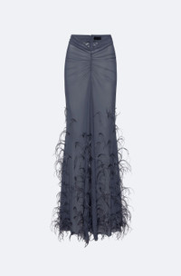 Featured In The Pre Fall 2025 Collection Mesh maxi skirt in our sheer stretch tulle. Features a center front gathering below the waist, ruching along the body, and feather embroidery throughout. - Material: 94% Polyester, 6% Elastane, 100% Struthio Camelus - Care: Hand Wash Cold or Dry Clean - Fit: True to size