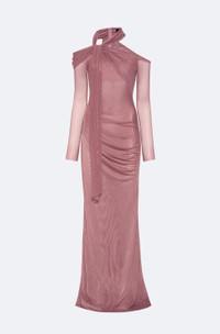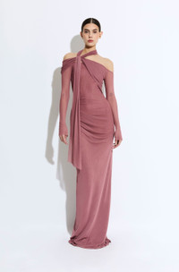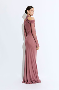 Long sleeve off the shoulder maxi dress in our sheer stretch tulle. Features asymmetric draped scarf neck line. - Material: 94% Polyester, 6% Elastane - Care: Hand Wash Cold or Dry Clean - Fit: True to size - Model is 5'10 and Wearing a Size S
