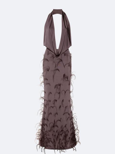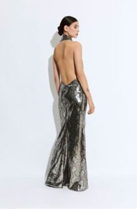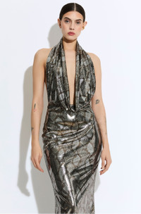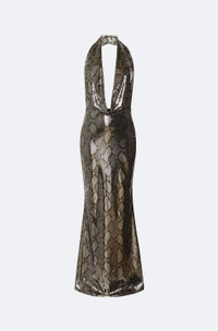 Featured In The Pre Fall 2025 Collection Deep cowl neck sleeveless maxi dress in high-shine metallic snake print. - Material: 100% Polyester - Care: Hand Wash Cold or Dry Clean - Fit: True to size - Model is 5'10 and Wearing a Size 2