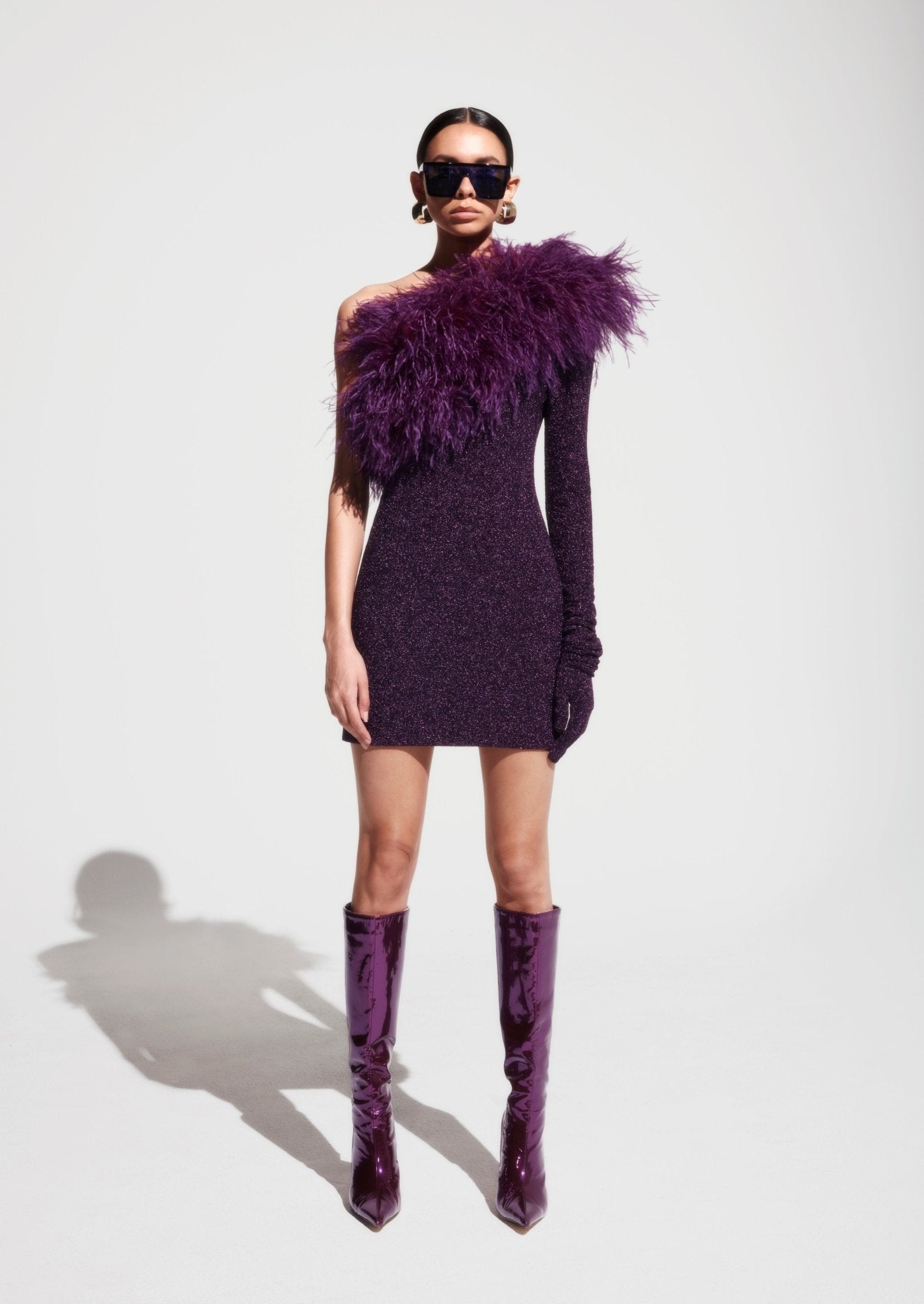Metallic Jersey One Shoulder Dress With Feathers