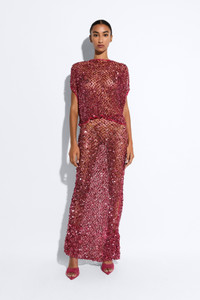 Featured in the Spring 25 Collection Flare skirt in our bestselling net mesh sequin fabric. Maxi length that sits at the natural waist. For the full look, pair with our net mesh sequin cape tee. - Material: 100% Nylon - Care: Hand Wash Cold or Dry Clean - Fit: True to size - Model is 5'10 and Wearing a size 2