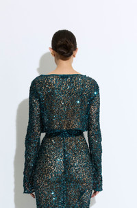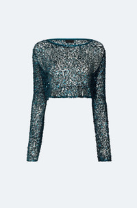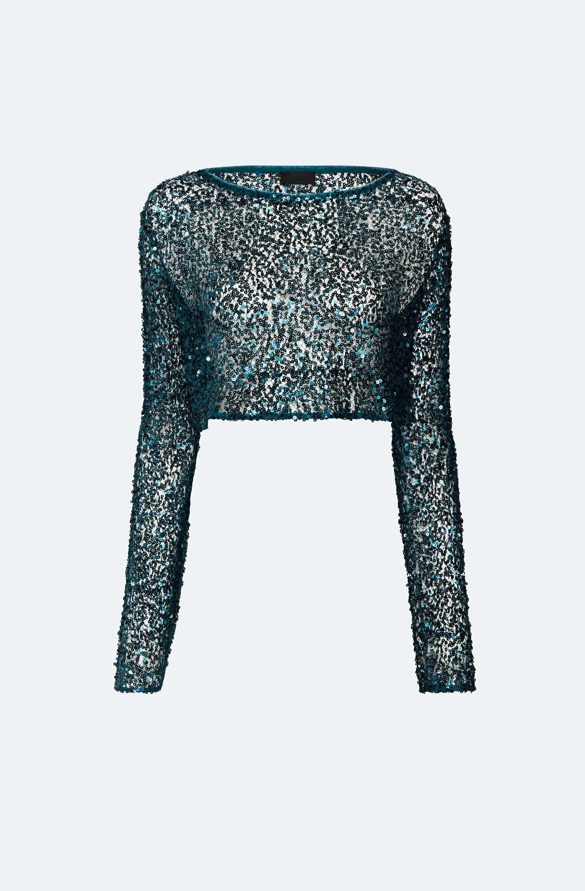 Featured In The Pre Fall 2025 Collection Long sleeve cropped boatneck top in our sheer net paillette. Pair with our net paillette maxi skirt for the complete look. - Material: 100% Nylon - Care: Hand Wash Cold or Dry Clean - Fit: True to size - Model is 5'10 and Wearing a Size S