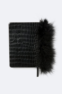 Featured in the Holiday Gift Guide Collection Faux leather notebook in an all over croc embossing. Gold leaf lined pages with a ribbon bookmark. Logo embossed at the front. Feathers along the side. - Material: 100% Polyurthane - Trim: 100% Leptoptilos Crumenifer