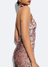 Featured In The Fall 2024 Collection This semi sheer abstract sequin gown features a halter neck with small button closure at center back, low back, and an invisible zipper. - Materials: 100% Polyester Sequin - Care: Professional Dry Clean Only - Fit: True to Size - Model is 5'10" and Wearing a 2