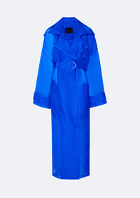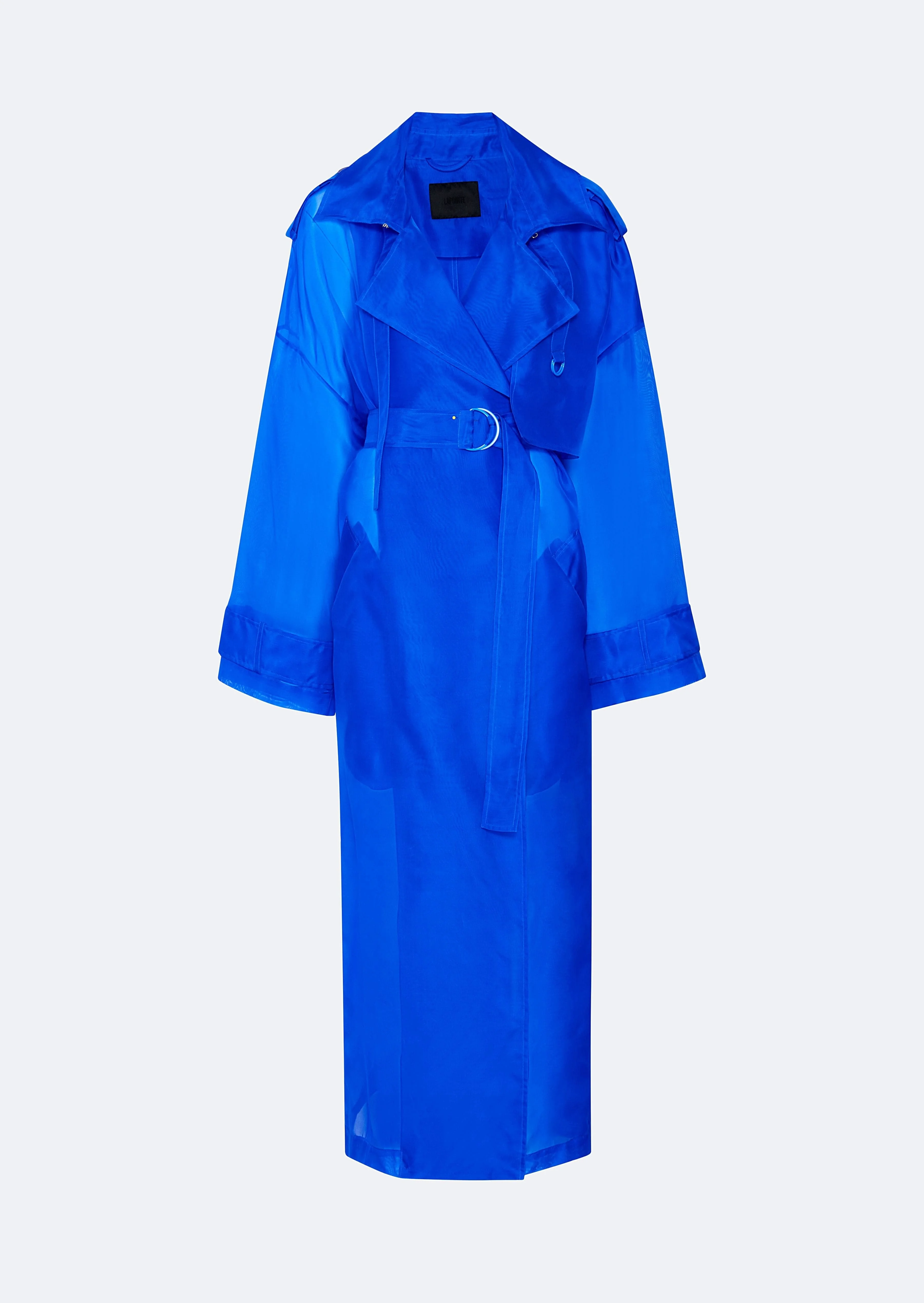 Featured in the Resort 25 Collection Double breasted trench in our luxurious organza fabrication. D-ring belt at the waist allows for an adjustable fit. - Material: 100% Silk - Fit: Oversized fit. For a less oversized fit, size down. - Care: Dry Clean Only - Model is 5'11" and Wearing a size Small