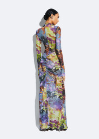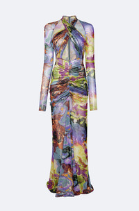 Featured In The Fall 2024 Runway Collection This marble printed stretch mesh gown features a halter neck, center front cut out and ruching throughout with a invisible zipper at back. - Materials: 93% Polyester, 7% Elastane - Care: Hand Wash Cold or Delicate Dry Clean Only - Fit: Slim fit. True to Size - Model is 5'10" and Wearing a S